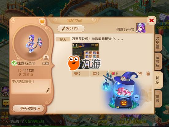 活动期间,达到40级的玩家,个人空间中会出现糖罐。每在任务中获得一颗糖果,个人空间的糖罐中都会自动加入一颗神气糖。这些神气糖是为你的好友准备的哦!当然,你也可以去摇摇好友的小糖罐~摇动他人的空间糖罐可以获得神气糖,食用神气糖可以变成可爱萌宠哦!如果自己的空间糖罐被摇动了十次,还可以获得一个可爱南瓜灯。