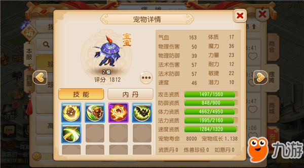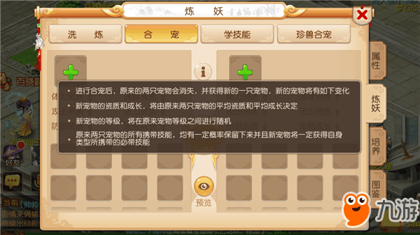 九游小编建议大家选择合宠胚子时,不妨尽量选择5技能宠,而且最好两只合宠胚子都有自己的必带技能。然后大家可以使用低级兽诀先打掉必带技能,并在保证两只胚子没有重复技能的情况下,将他们合成,这样就有更多的概率获得多技能神宠了!