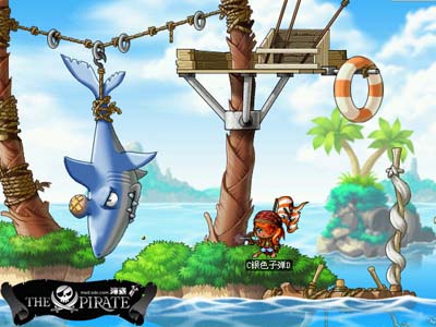 海盗的勇敢有时还是忍不住拿来炫耀一番,看,凶猛的鲨鱼被拳手海盗修理了一顿拖了回来。那我就占个小便宜,吊起来打,让昔日的“海中霸王”也尝尝我的糖丸子弹……