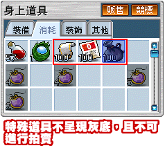 b.特殊道具包含: 部份稀有道具、飞鏢类道具、怪物召唤包、各类幸运御守,此类道具在身上道具栏并不会以灰底
