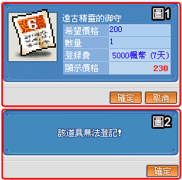 在点击确定按钮后,将出现“该道具无法登记!”之错误讯息。(图2)