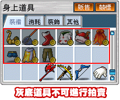 角色身上的道具栏,当道具栏内的道具为灰底时,代表此样道具无法进行拍卖。无法直接进行拍卖的道具包含:不可交易、不可丢弃、任务专属、已封印之道具、加值道具与特殊道具。