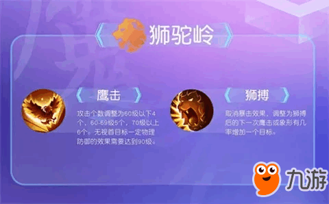 狮驼岭的小伙伴大部分时间都是在利用鹰击攻击目标单位,狮搏一向是在需要配合点杀时使用,现在该技能调整为狮搏后下一次鹰击或象形有几率增加一个目标单位,一定程度上提升了狮驼岭在第二回合的面伤输出。如果搭配上大鹏王那将又是另一番景象。