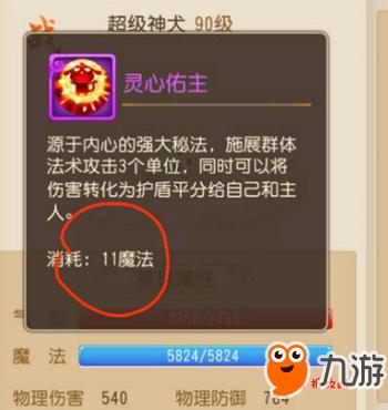 2、灵心佑主:法术攻击 3 个单位,并将所造成伤害的 10% 转化为护盾平分给自己合主人,90级只消耗 11 点魔法。